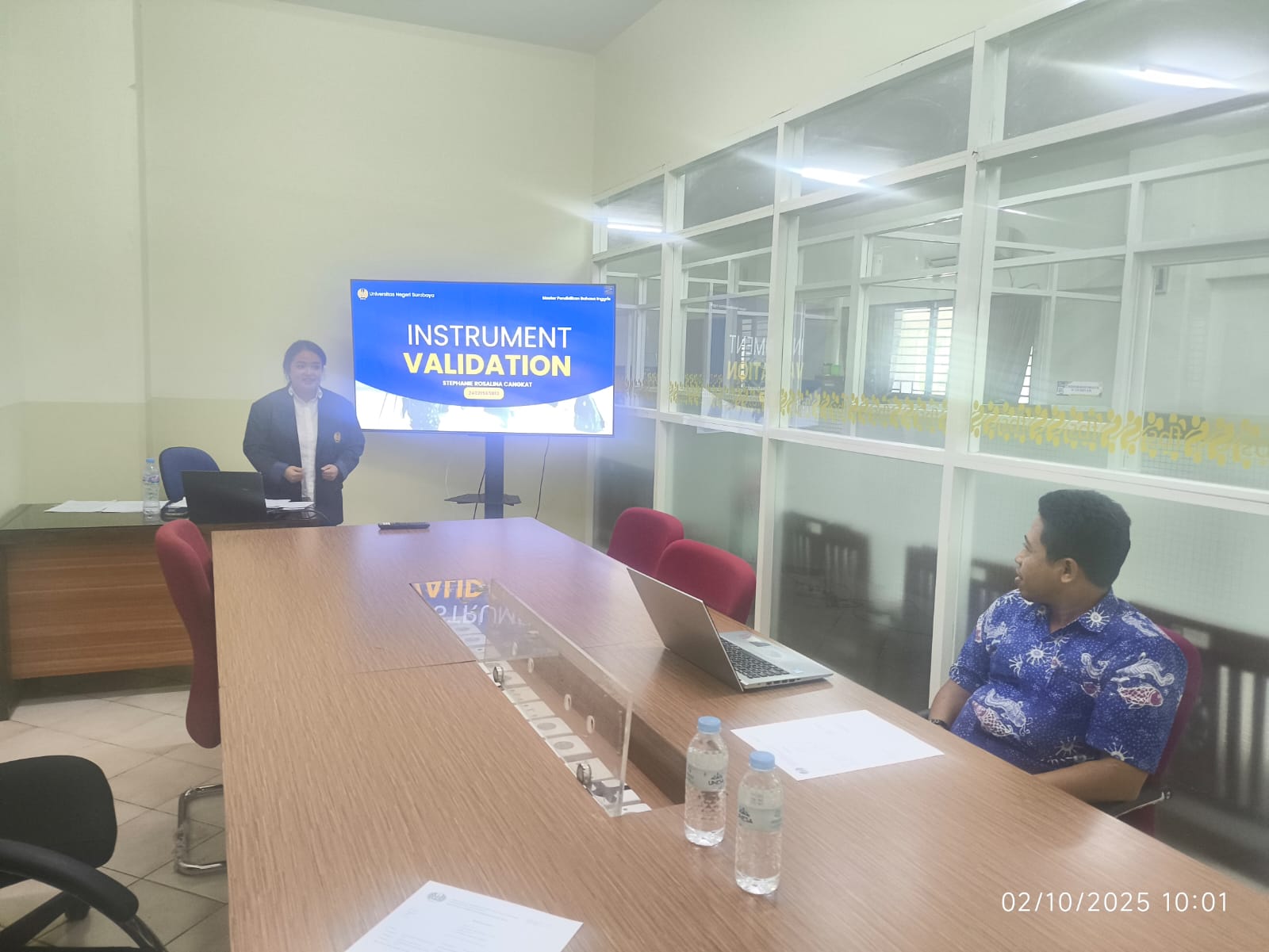 Stephanie Rosalina Cangkat, a graduate student from the 2024 cohort of the Master’s Program in English Language Education, Universitas Negeri Surabaya, on October 2, 2025, held a seminar to validate her designed and developed research instrument