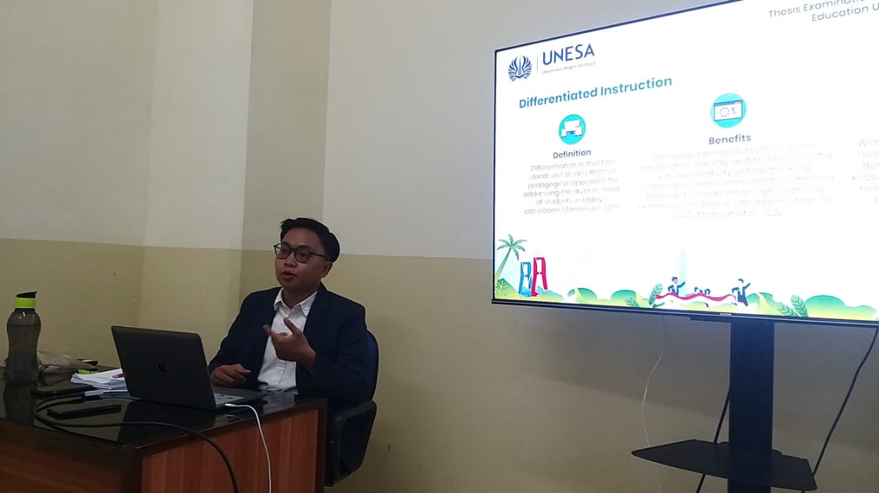 On October 2, 2025, Zulfikri Malik, a graduate student from the 2023 cohort of the Master’s Program in English Language Education at Universitas Negeri Surabaya (UNESA), successfully defended his master’s thesis. His research explored how English teachers at Islamic junior high schools adapt their teaching techniques and media to address the varied needs of their students. The study sheds light on practical approaches to differentiated instruction in real classroom settings.